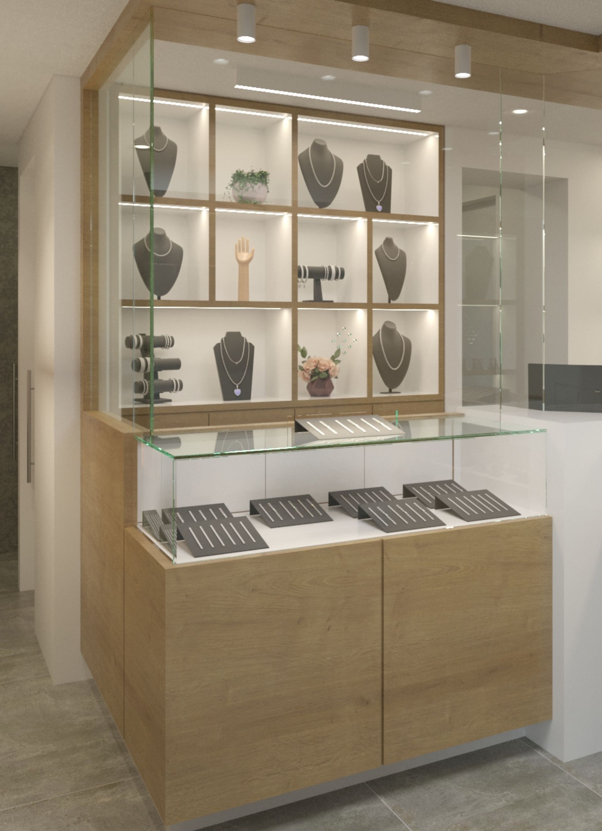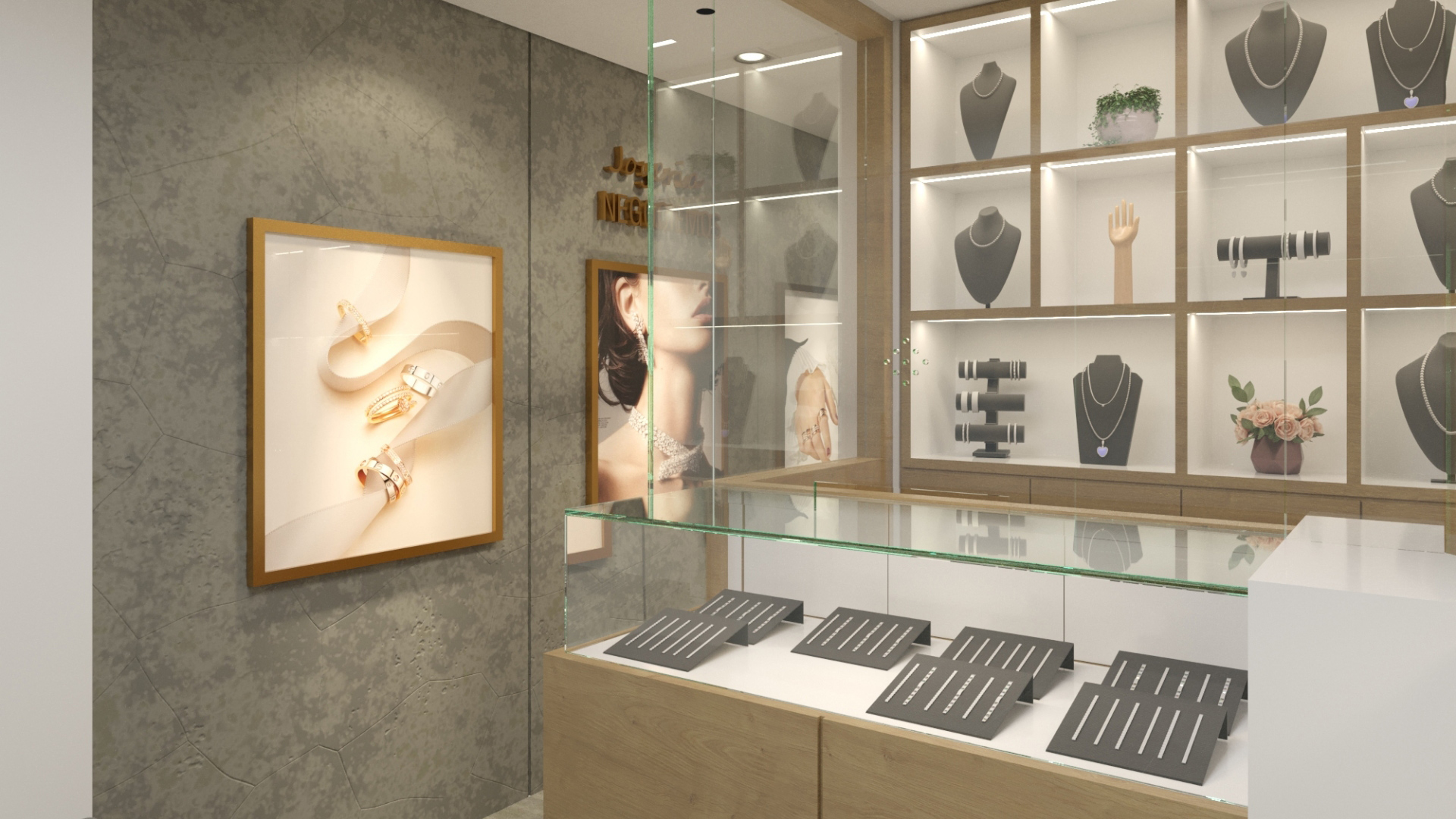 Para este proyecto se trabajo en la creación de un espacio que combina la pureza del cristal con una iluminación cuidadosamente estudiada para maximizar la percepción del lujo y la exclusividad. El diseño integra mobiliario, vitrinas y elementos arquitectónicos de cristal que generan una sensación de amplitud y ligereza, permitiendo que cada joya se convierta en el centro de atención. La iluminación, tanto ambiental como puntual, está diseñada para realzar el brillo y los detalles más delicados de las piezas, creando una atmósfera cálida y sofisticada que invita al cliente a una experiencia sensorial única. Este proyecto no solo busca exhibir productos, sino también transmitir la identidad y el estilo de la marca a través de un entorno contemporáneo, transparente y luminoso.