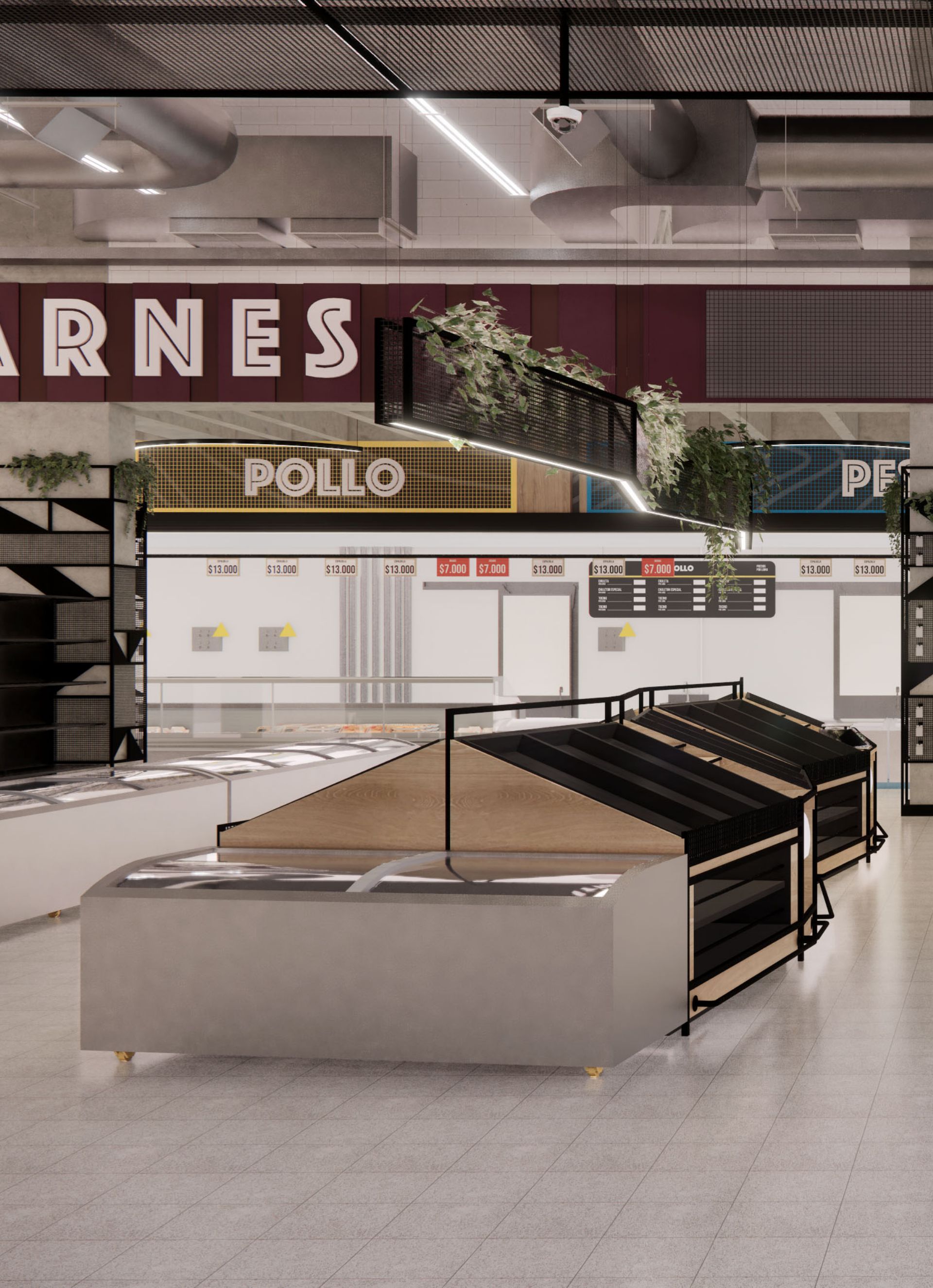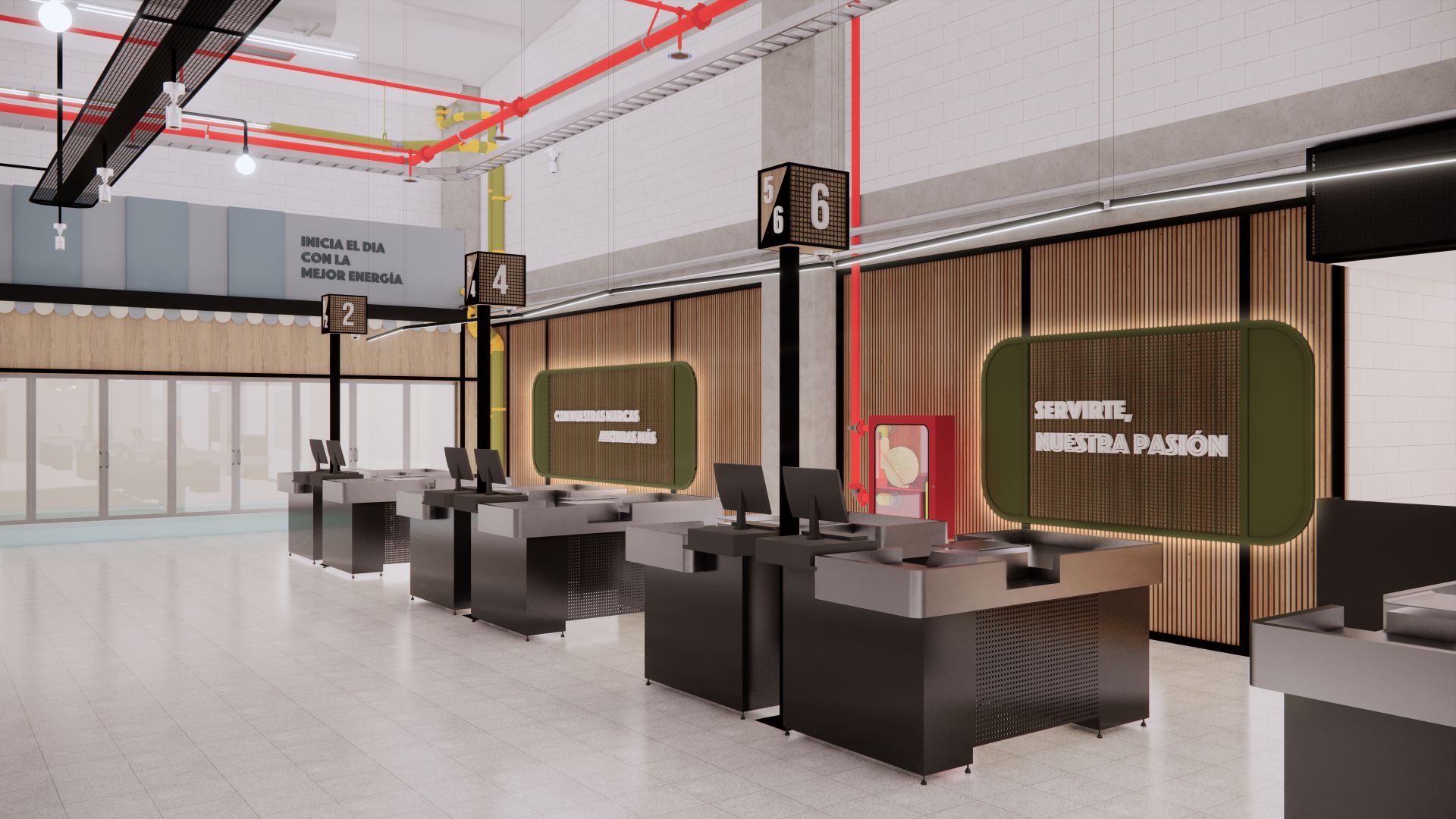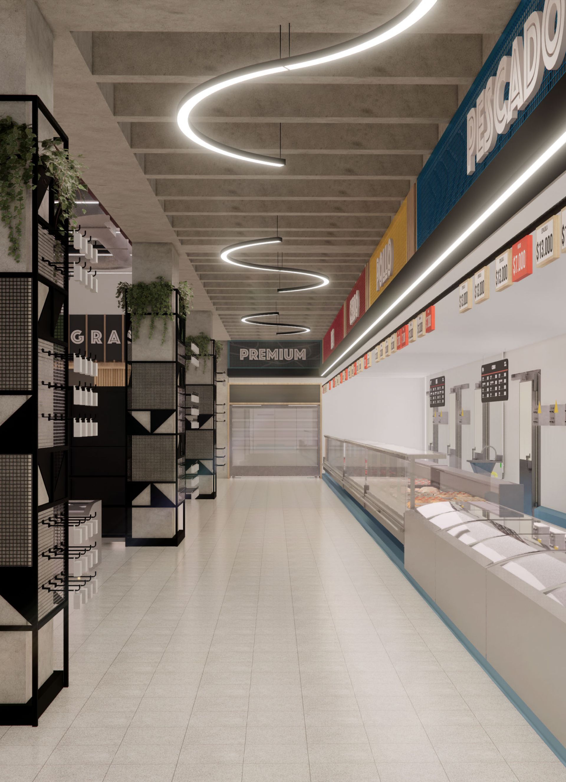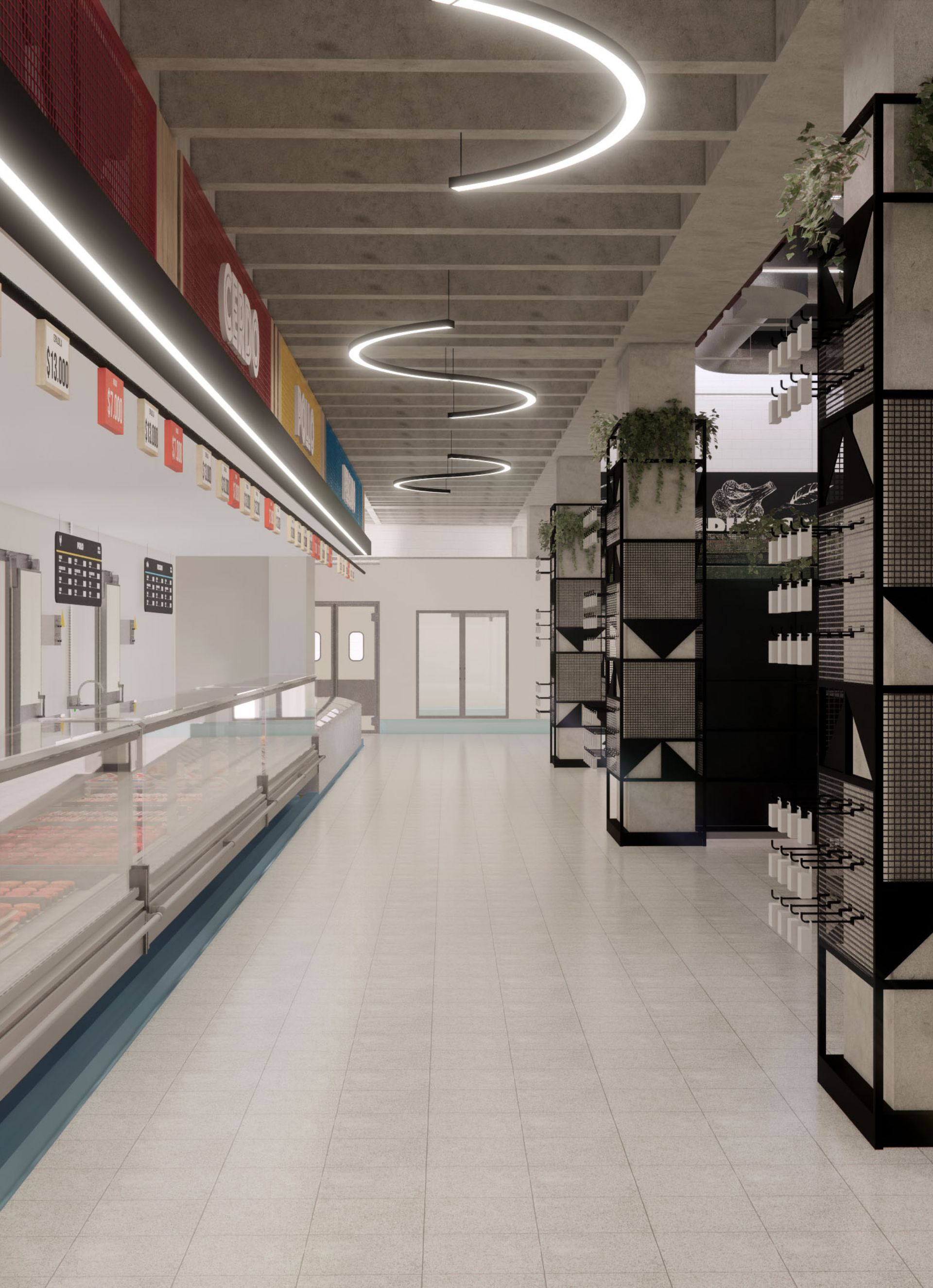 El diseño arquitectónico del supermercado propone un ambiente cálido y accesible que invita a los clientes a disfrutar cada momento de su compra. Se optimizó la distribución para facilitar la movilidad y el acceso a los productos, creando zonas diferenciadas que mejoran la organización y el orden. La iluminación cuidadosamente planificada realza la visibilidad de los productos y genera una atmósfera agradable y moderna en todo el espacio. Además, se diseñaron amplias góndolas que permiten una exhibición clara y ordenada, facilitando la experiencia de compra y promoviendo el fácil acceso a una variedad de artículos. El uso de materiales sostenibles refleja el compromiso con el medio ambiente, mientras que el conjunto del proyecto busca ofrecer un espacio funcional, estético y acogedor que responda a las necesidades del consumidor contemporáneo. Se prestó especial atención a la circulación eficiente para evitar aglomeraciones y mejorar el flujo de clientes, garantizando comodidad y seguridad. La integración de elementos de diseño que aportan calidez y modernidad contribuye a fortalecer la identidad del supermercado como un espacio confiable y cercano.