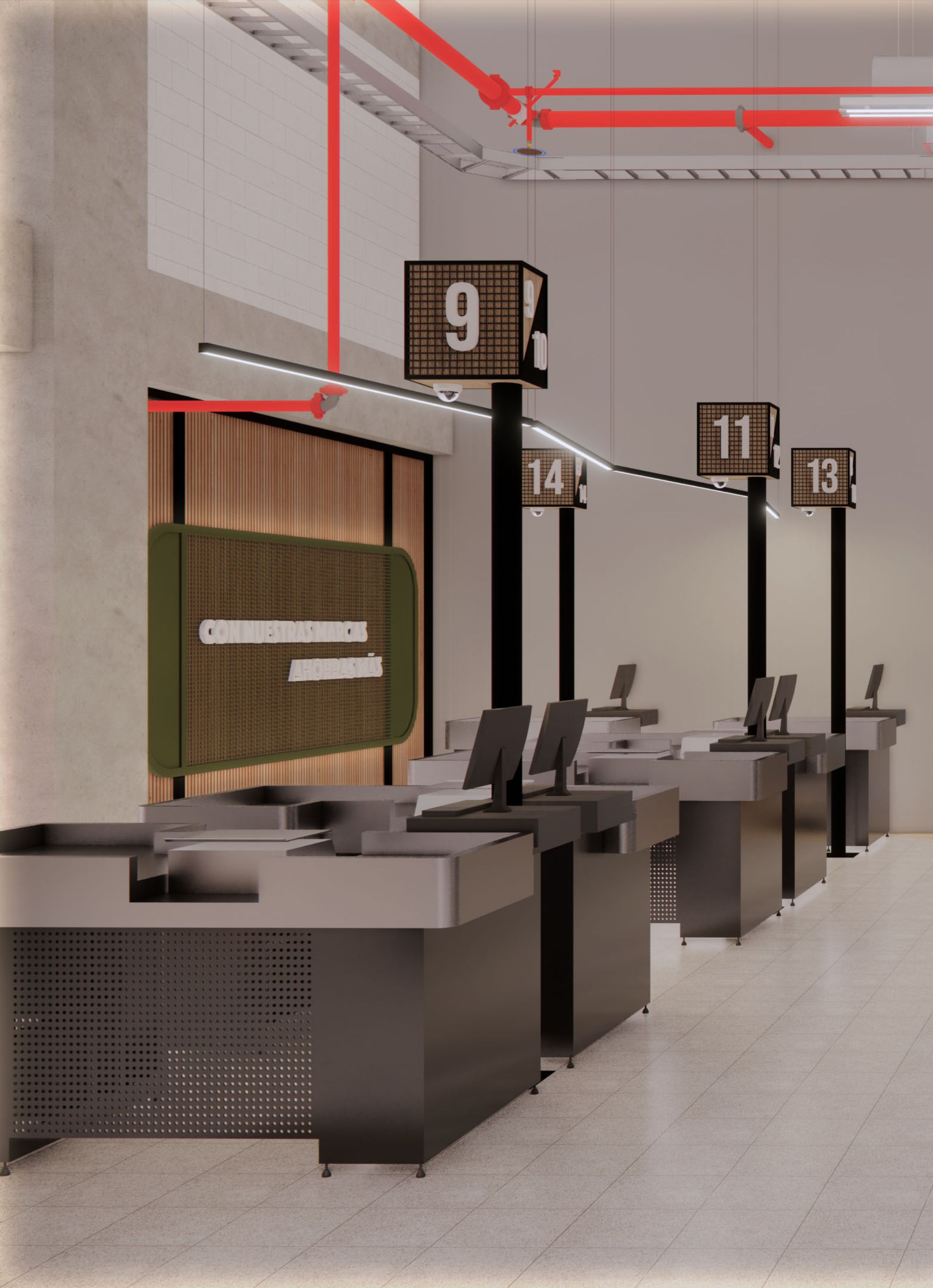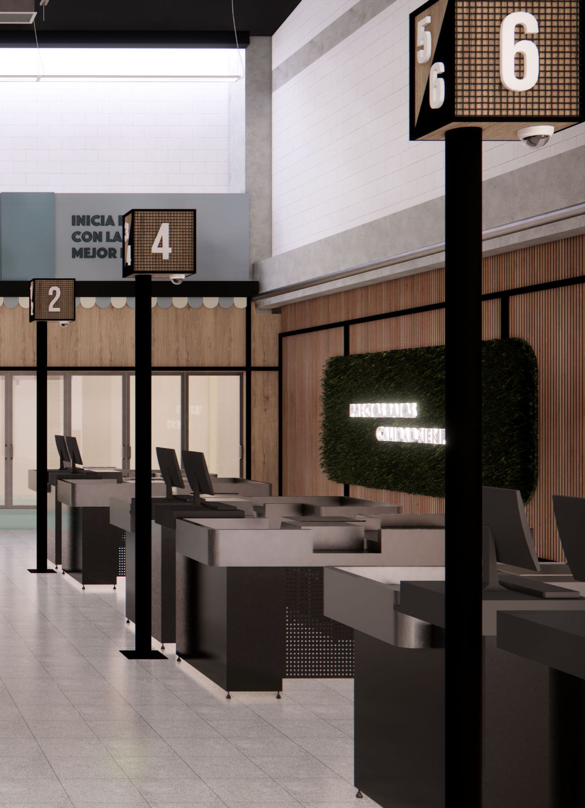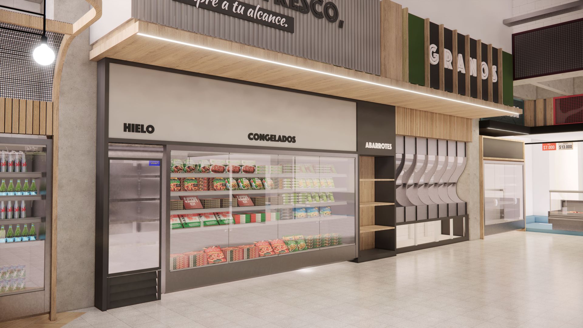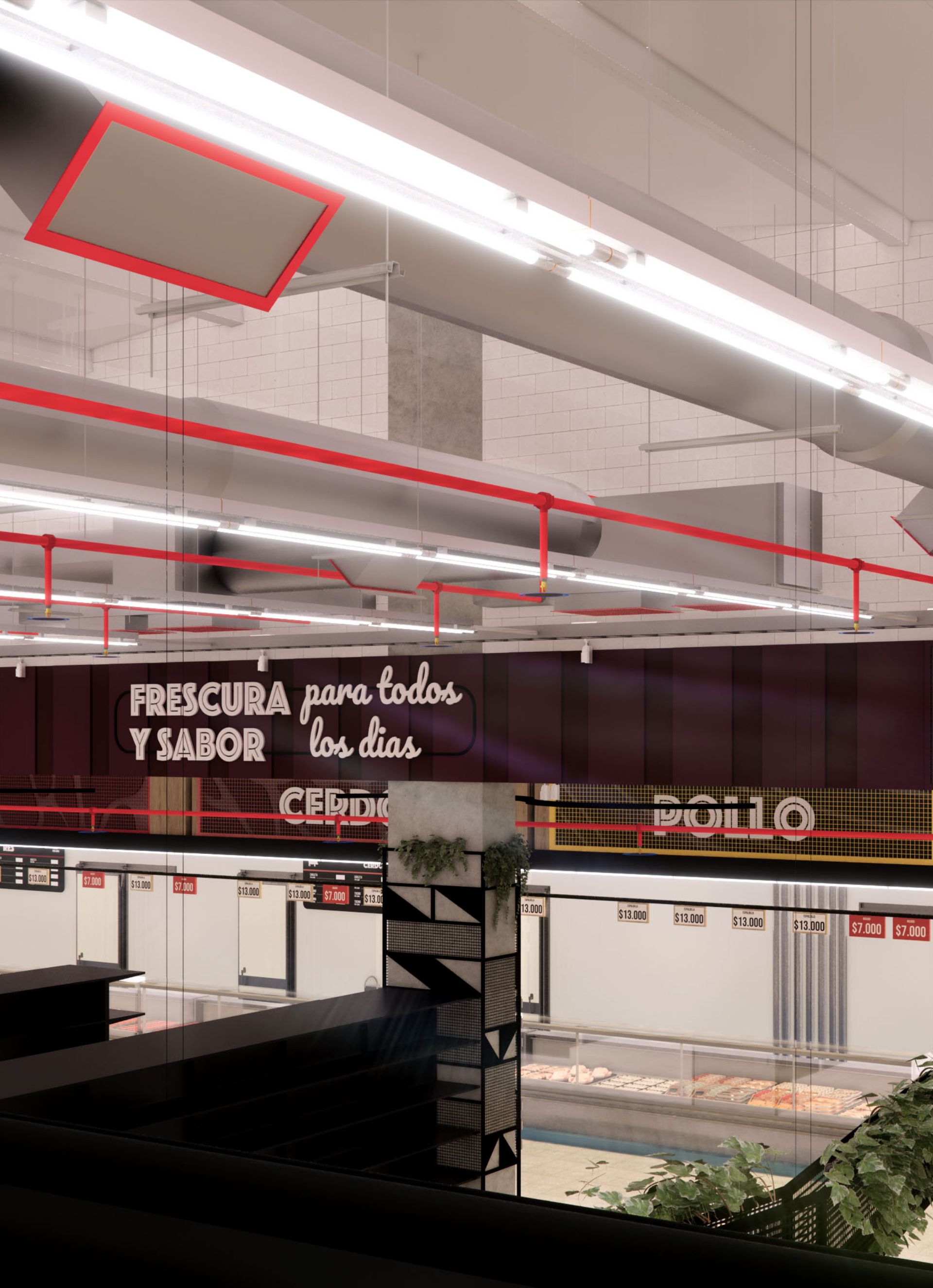El diseño arquitectónico del supermercado propone un ambiente cálido y accesible que invita a los clientes a disfrutar cada momento de su compra. Se optimizó la distribución para facilitar la movilidad y el acceso a los productos, creando zonas diferenciadas que mejoran la organización y el orden. La iluminación cuidadosamente planificada realza la visibilidad de los productos y genera una atmósfera agradable y moderna en todo el espacio. Además, se diseñaron amplias góndolas que permiten una exhibición clara y ordenada, facilitando la experiencia de compra y promoviendo el fácil acceso a una variedad de artículos. El uso de materiales sostenibles refleja el compromiso con el medio ambiente, mientras que el conjunto del proyecto busca ofrecer un espacio funcional, estético y acogedor que responda a las necesidades del consumidor contemporáneo. Se prestó especial atención a la circulación eficiente para evitar aglomeraciones y mejorar el flujo de clientes, garantizando comodidad y seguridad. La integración de elementos de diseño que aportan calidez y modernidad contribuye a fortalecer la identidad del supermercado como un espacio confiable y cercano.